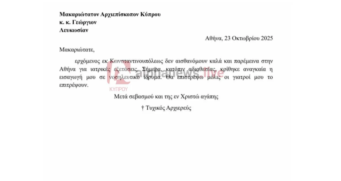 Στις 23 Οκτωβρίου 2025, ο Τυχικός ενημέρωσε τον προκαθήμενο της Εκκλησίας της Κύπρου για την κατάσταση της υγείας του, εξηγώντας ότι ερχόμενος από την Κωνσταντινούπολη δεν αισθάνθηκε καλά και χρειάστηκε να νοσηλευθεί στην Αθήνα. «Θα επιστρέψω μόλις οι γιατροί το επιτρέψουν», ανέφερε με αξιοπρέπεια στην επιστολή του. Και όμως, αυτή η απλή ανθρώπινη επικοινωνία φαίνεται να προκάλεσε περισσότερα ερωτήματα απ’ όσα απαντήσεις.