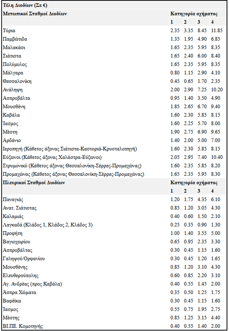 Αναλυτικά, οι τιμές ανά μετωπικό και πλευρικό σταθμό διοδίων θα διαμορφωθούν ως εξής: