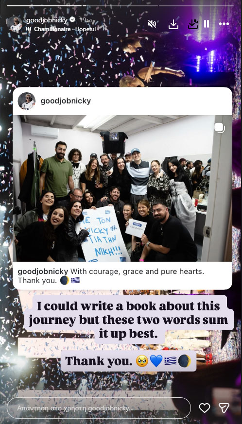 Ο Good Job Nicky έστειλε το δικό του μήνυμα στους υποστηρικτές του μετά τον ελληνικό τελικό του «Sing for Greece», όπου επιλέχθηκε το τραγούδι που θα εκπροσωπήσει την Ελλάδα στη Eurovision 2026.