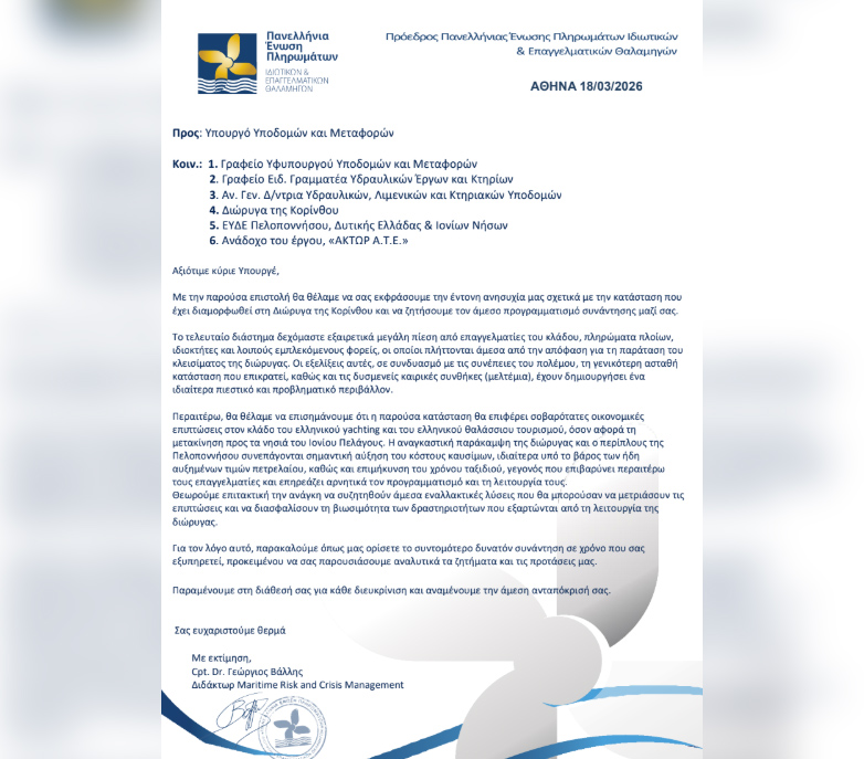 Σημαντική παρέμβαση προς το Υπουργείο Υποδομών και Μεταφορών πραγματοποίησε ο πρόεδρος της Πανελλήνιας Ένωσης Πληρωμάτων Ιδιωτικών και Επαγγελματικών Θαλαμηγών Cpt. Dr. Γιώργος Βάλλης, εκφράζοντας την έντονη ανησυχία του για τον κλάδο του θαλάσσιου τουρισμού σχετικά με την παρατεταμένη αναστολή λειτουργίας της Διώρυγα της Κορίνθου.