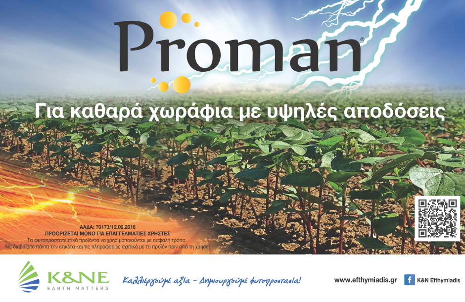 Μέσα σε αυτό το πλαίσιο, το PROMAN αποτελεί την καινούργια και αποτελεσµατική πρόταση της Κ&Ν Ευθυµιάδης για τη ζιζανιοκτονία του βαµβακιού και απευθύνεται σε όλους εκείνους τους παραγωγούς που αναζητούν την καινοτοµία και την εξέλιξη, µιας και λύνει το πρόβληµα των σηµαντικότερων πλατύφυλλων αλλά και ορισµένων στενόφυλλων ζιζανίων, που υπάρχουν στην καλλιέργεια του βαµβακιού.