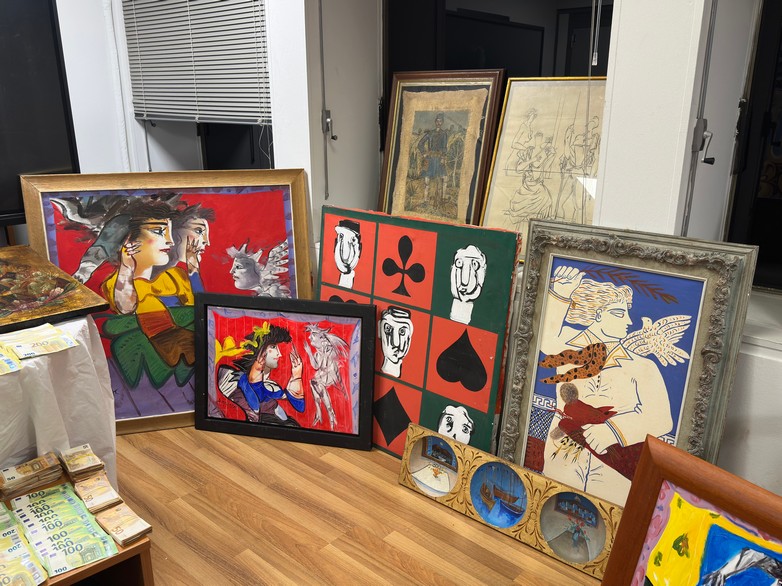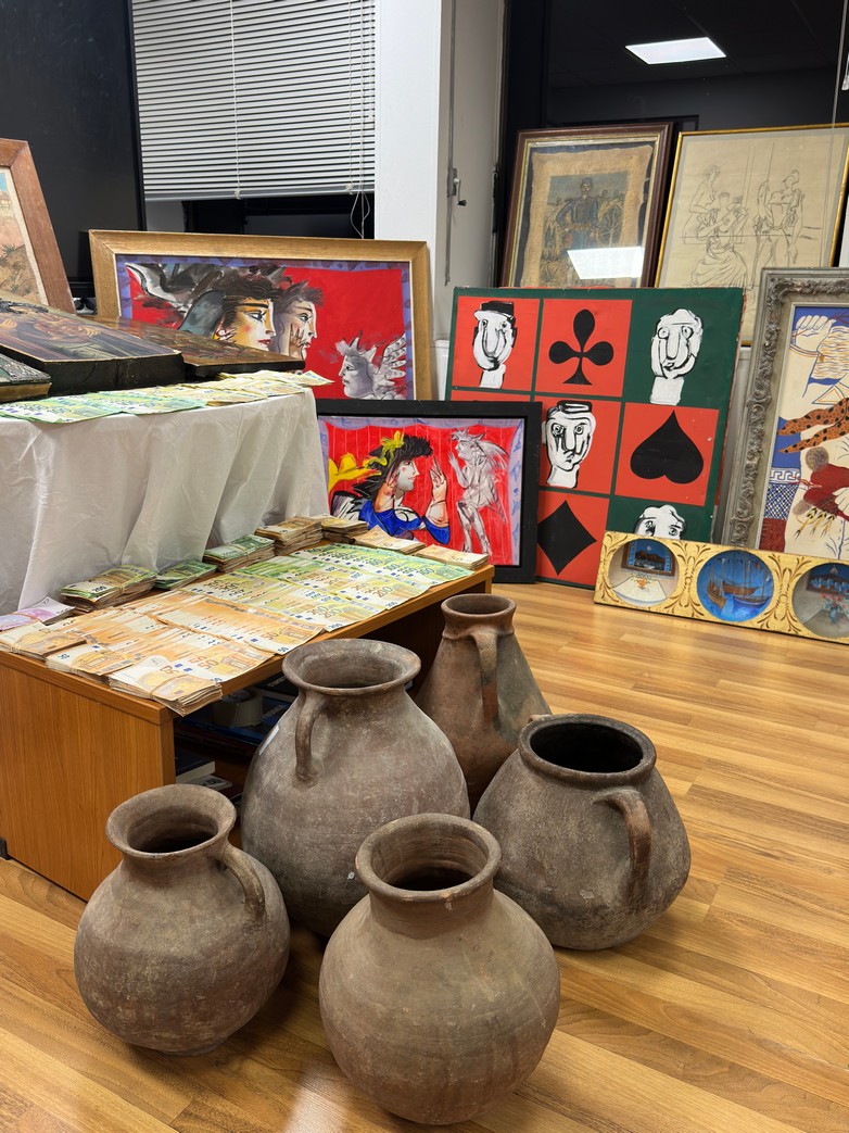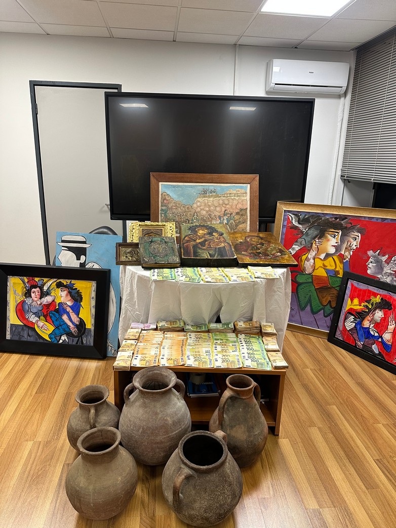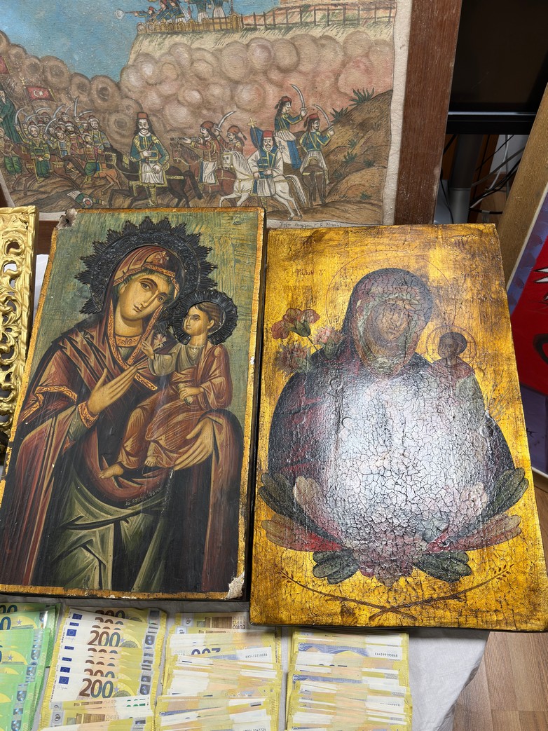 Όπως επισημαίνεται από την ΕΛ.ΑΣ. κατά τη συντονισμένη αστυνομική επιχείρηση της Διεύθυνσης Αντιμετώπισης Οργανωμένου Εγκλήματος, που πραγματοποιήθηκε την Παρασκευή, 20 Μαρτίου, κατασχέθηκαν 321 έργα τέχνης, τέσσερις ξύλινες αρχαίες ιερές εικόνες, ένα Ευαγγέλιο, τρεις αρχαίοι αμφορείς, αντικείμενα βυζαντινής περιόδου, μεγάλα χρηματικά ποσά, όπλο, φυσίγγια και ψηφιακά πειστήρια.