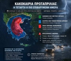 Ειδικότερα την Τετάρτη, στην ανατολική χώρα, θα πνέουν ανατολικοί νοτιοανατολικοί άνεμοι εντάσεως 8 με 9, και τοπικά στην περιοχή των Δωδεκανήσων 10 μποφόρ.