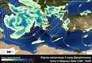 Στον παρακάτω χάρτη παρουσιάζεται ο αθροιστικός υετός 3-ώρου κατά το διάστημα 15:00 – 18:00 της Τρίτης, 31 Μαρτίου 2026. Ξεχωρίζει το ισχυρό βαρομετρικό χαμηλό με κέντρο τη Νότια Ιταλία που αναμένεται να προκαλέσει την επιδείνωση του καιρού στη χώρα μας.